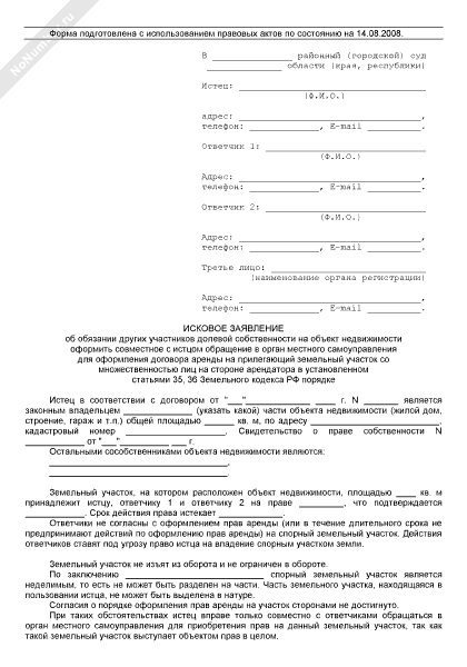 - 304Исковое заявление в суд общей юрисдикции об обязании других участников долевой собственности на объект недвижимости оформить совместное с истцом обращение в орган местного самоуправления для оформления договора аренды на прилегающий земельный участок со множественностью лиц на стороне арендатора в установленном статьями 35, 36 Земельного кодекса РФ порядке (физические лица)