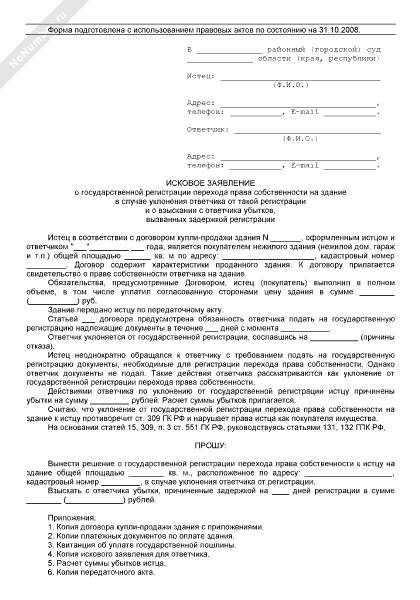 - 306Исковое заявление в суд общей юрисдикции о государственной регистрации перехода права собственности на здание в случае уклонения ответчика от такой регистрации и о взыскании с ответчика убытков, вызванных задержкой регистрации