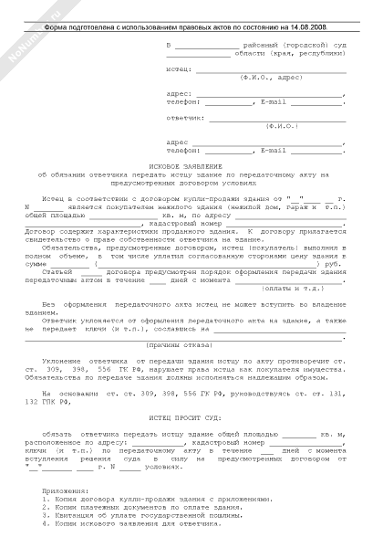 - 309Исковое заявление в суд общей юрисдикции об обязании ответчика передать истцу здание по передаточному акту на предусмотренных договором условиях (физические лица)
