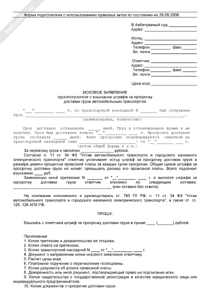 - 322Исковое заявление грузополучателя в арбитражный суд о взыскании штрафа за просрочку доставки груза междугородным автомобильным транспортом
