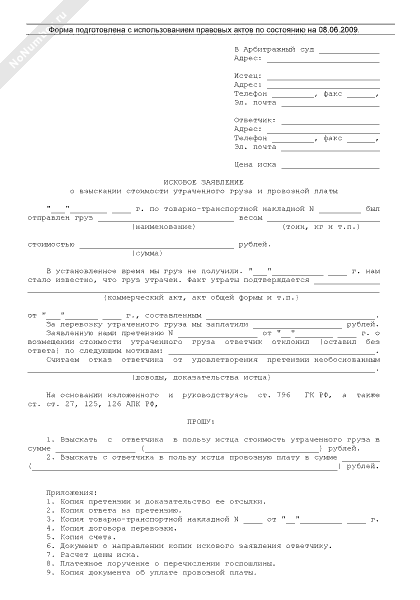 - 325Исковое заявление грузополучателя о взыскании стоимости утраченного груза и провозной платы