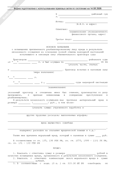 - 337Исковое заявление о возмещении реабилитированному лицу материального и морального вреда, причиненного в результате незаконного осуждения, на основании полной отмены надзорной инстанцией вступившего в законную силу обвинительного приговора суда