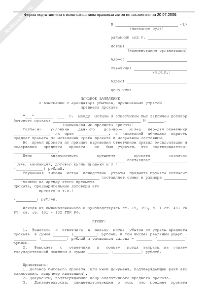 - 329Исковое заявление в суд общей юрисдикции о взыскании с арендатора убытков, причиненных утратой предмета проката
