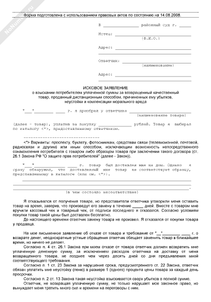 - 328Исковое заявление о взыскании потребителем уплаченной суммы за возвращенный качественный товар, проданный дистанционным способом, причиненных ему убытков, неустойки и компенсации морального вреда