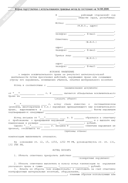 - 335Исковое заявление о защите исключительного права на результат интеллектуальной деятельности путем пресечения действий, нарушающих право или создающих угрозу его нарушения, возмещения убытков, изъятия материального носителя