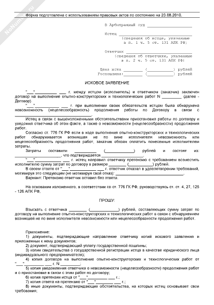 - 418Исковое заявление исполнителя по договору на выполнение опытно-конструкторских и технологических работ в арбитражный суд о взыскании с заказчика понесенных исполнителем затрат в связи с обнаружением возникшей не по вине исполнителя невозможности или нецелесообразности продолжения работ