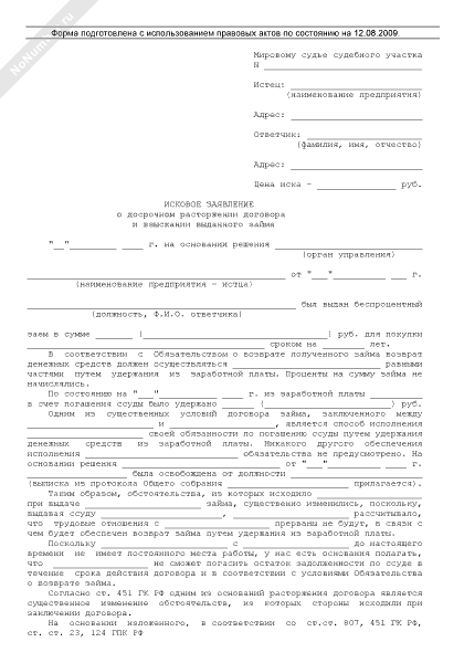 - 410Исковое заявление о досрочном расторжении договора и взыскании выданного займа