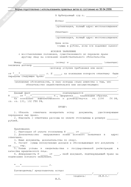 - 409Исковое заявление о восстановлении положения, существовавшего до передачи права другому лицу на основании недействительного обязательства