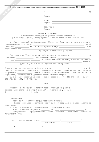 - 416Исковое заявление о взыскании расходов на ремонт общего имущества (на примере здания, находящегося в общей долевой собственности)