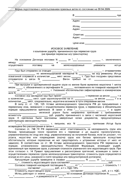 - 415Исковое заявление о взыскании ущерба, причиненного при перевозке груза (на примере перевозки ж/д транспортом)