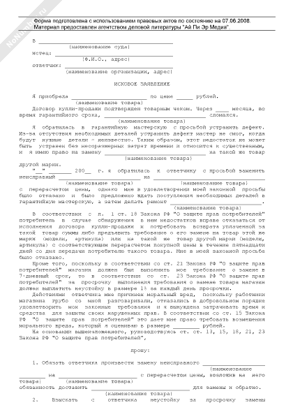 - 405Исковое заявление об обязании ответчика произвести замену товара с существенным недостатком, взыскании неустойки и компенсации за моральный вред