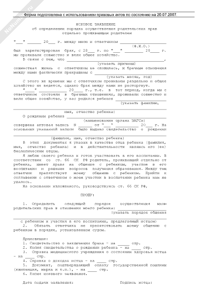 - 402Исковое заявление об определении порядка осуществления родительских прав отдельно проживающим родителем