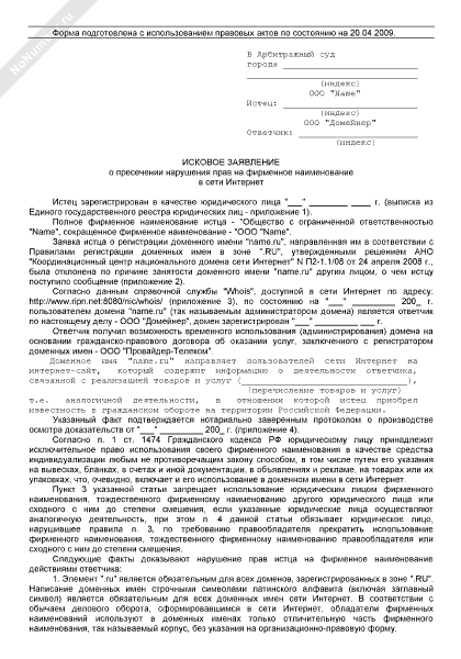 - 444Исковое заявление о пресечении нарушения прав на фирменное наименование в сети Интернет