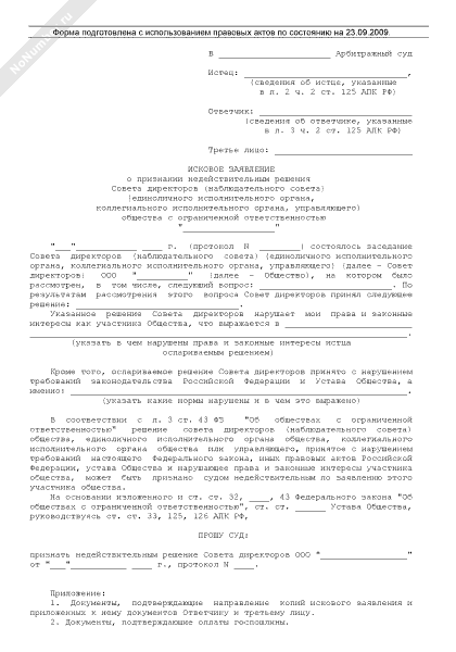 - 448Исковое заявление о признании недействительным решения совета директоров (наблюдательного совета) (единоличного исполнительного органа, коллегиального исполнительного органа, управляющего) общества с ограниченной ответственностью