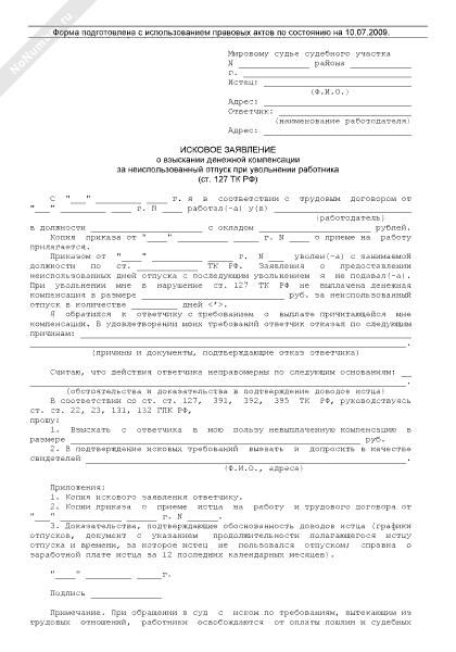- 442Исковое заявление о взыскании денежной компенсации за неиспользованный отпуск при увольнении работника (ст. 127 ТК РФ)