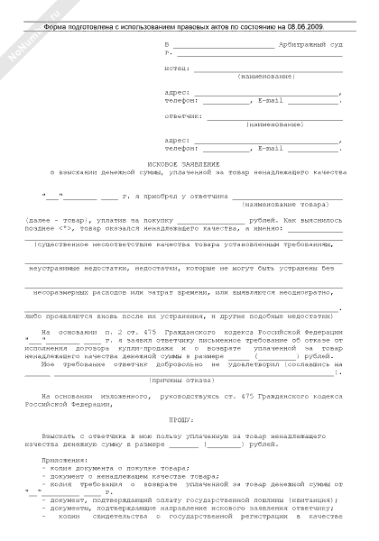 - 460Исковое заявление о взыскании денежной суммы, уплаченной за товар ненадлежащего качества