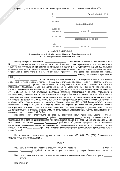 - 452Исковое заявление о взыскании остатка денежных средств с банковского счета и о возмещении причиненных убытков