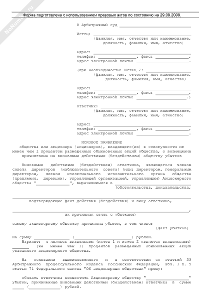 - 449Исковое заявление общества или акционера (акционеров), владеющего(их) в совокупности не менее чем 1 процентом размещенных обыкновенных акций общества к члену совета директоров (наблюдательного совета) общества, единоличному исполнительному органу общества, временному единоличному исполнительному органу общества, члену коллегиального исполнительного органа общества, управляющей организации (управляющему) о возмещении убытков, причиненных их виновными действиями (бездействием) обществу