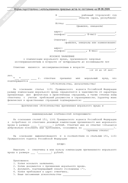 - 487Исковое заявление о компенсации морального вреда, причиненного здоровью несовершеннолетним в возрасте от четырнадцати до восемнадцати лет