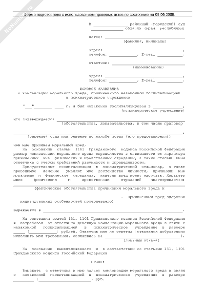 - 490Исковое заявление о компенсации морального вреда, причиненного незаконной госпитализацией в психиатрическое учреждение