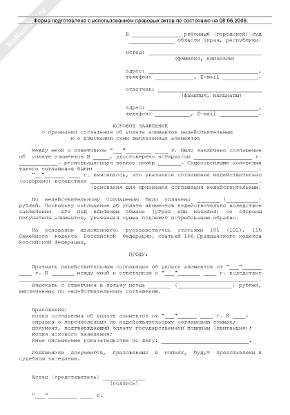 - 494Исковое заявление о признании соглашения об уплате алиментов недействительным и о взыскании сумм выплаченных алиментов