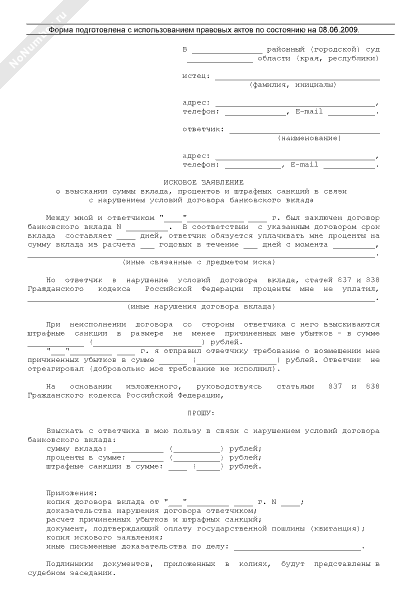 - 491Исковое заявление о взыскании суммы вклада, процентов и штрафных санкций в связи с нарушением условий договора банковского вклада