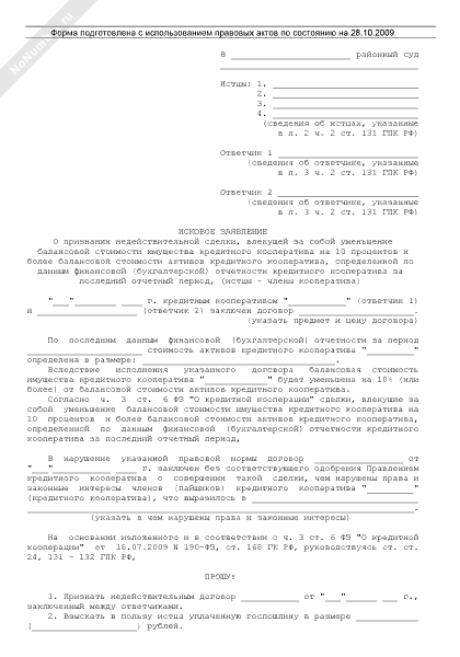 - 572Исковое заявление членов кредитного кооператива в суд общей юрисдикции о признании недействительной сделки кредитного кооператива, влекущей за собой уменьшение балансовой стоимости имущества кредитного кооператива на 10 процентов и более балансовой стоимости активов кредитного кооператива, совершенной без одобрения правления кооператива