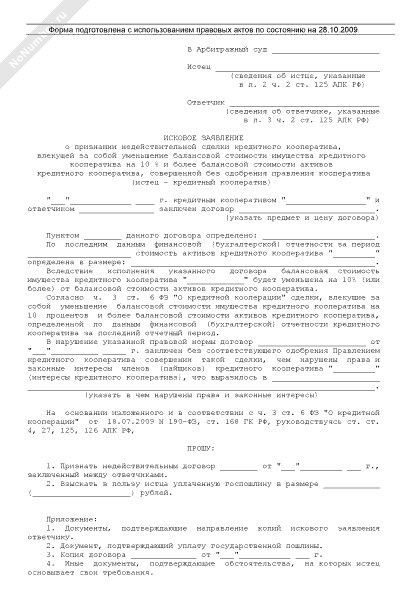 - 569Исковое заявление кредитного кооператива в арбитражный суд о признании недействительной сделки кредитного кооператива, влекущей за собой уменьшение балансовой стоимости имущества кредитного кооператива на 10 процентов и более балансовой стоимости активов кредитного кооператива, совершенной без одобрения правления кооператива