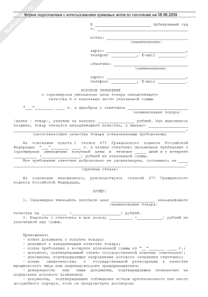 - 563Исковое заявление о соразмерном уменьшении цены товара ненадлежащего качества и о взыскании части уплаченной суммы