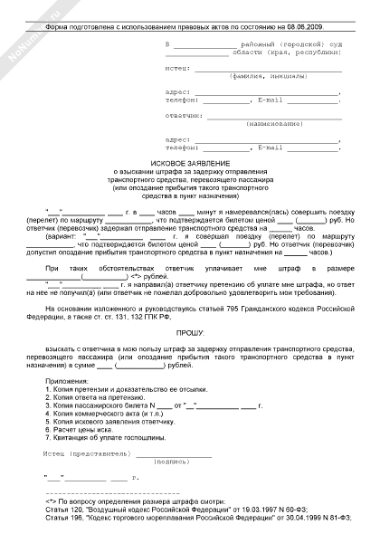 - 577Исковое заявление о взыскании штрафа за задержку отправления транспортного средства, перевозящего пассажира (или опоздание прибытия такого транспортного средства в пункт назначения)