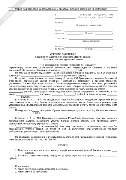 - 578Исковое заявление о взыскании ущерба, причиненного утратой багажа, а также взыскании провозной платы