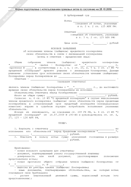 - 576Исковое заявление об исполнении членом (пайщиком) кредитного кооператива своих обязательств в связи с ликвидацией кооператива (истец и ответчик — юридические лица)