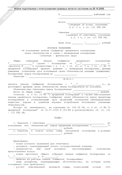 - 575Исковое заявление об исполнении членом (пайщиком) кредитного кооператива своих обязательств в связи с ликвидацией кооператива (ответчик — физическое лицо)