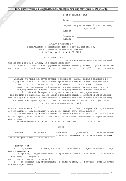 - 618Исковое заявление в арбитражный суд о понуждении к изменению фирменного наименования, не соответствующего требованиям законодательства