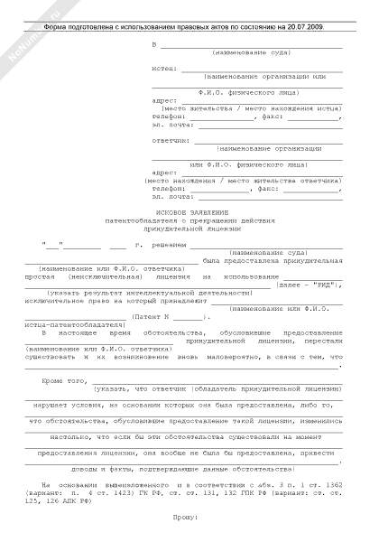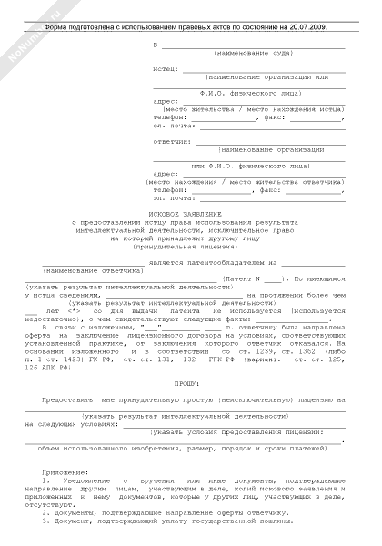 - 614Исковое заявление о предоставлении истцу права использования результата интеллектуальной деятельности, исключительное право на который принадлежит другому лицу (принудительная лицензия)