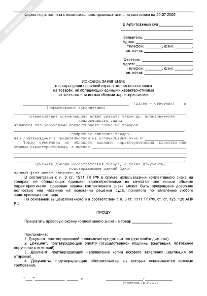 - 619Исковое заявление о прекращении правовой охраны коллективного знака на товарах, не обладающих едиными характеристиками их качества или иными общими характеристиками