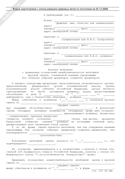 - 609Исковое заявление о применении последствий недействительности ничтожной крупной сделки, совершенной внешним управляющим без согласия собрания кредиторов (комитета кредиторов)