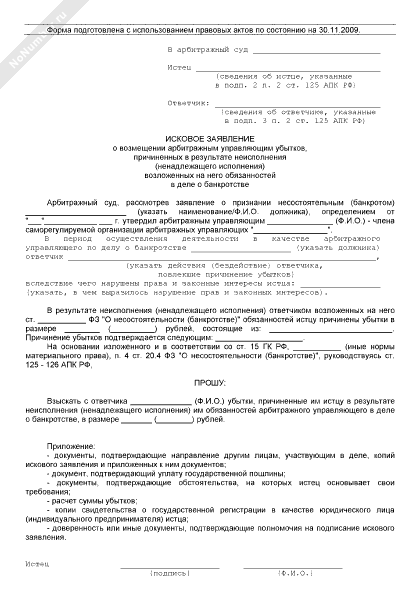 - 602Исковое заявление о возмещении арбитражным управляющим убытков, которые причинены в результате неисполнения или ненадлежащего исполнения арбитражным управляющим возложенных на него обязанностей в деле о банкротстве и факт причинения которых установлен вступившим в законную силу решением суда