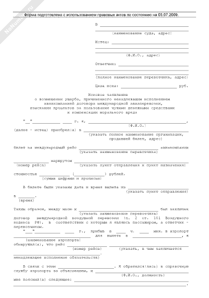 - 613Исковое заявление о возмещении ущерба, причиненного ненадлежащим исполнением авиакомпанией договора международной авиаперевозки (непредоставление информации об изменении времени вылета, в результате чего пассажир опоздал на самолет), взыскании процентов за пользование чужими денежными средствами и компенсации морального вреда