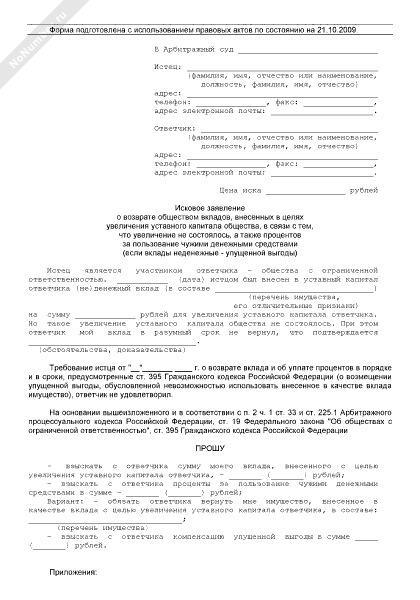 - 607Исковое заявление о возврате обществом вкладов, внесенных в целях увеличения уставного капитала общества, в связи с тем, что увеличение не состоялось, а также процентов за пользование чужими денежными средствами (если вклады неденежные — упущенной выгоды)