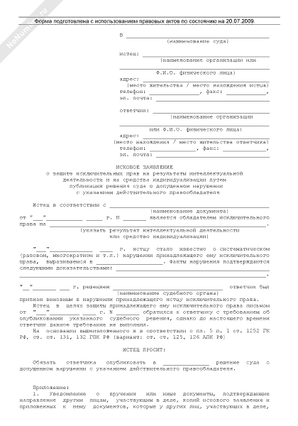 - 617Исковое заявление о защите исключительных прав на результаты интеллектуальной деятельности и на средства индивидуализации путем публикации решения суда о допущенном нарушении с указанием действительного правообладателя