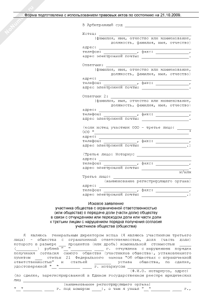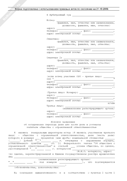 - 603Исковое заявление об оспаривании перехода доли или части доли в уставном капитале общества с ограниченной ответственностью