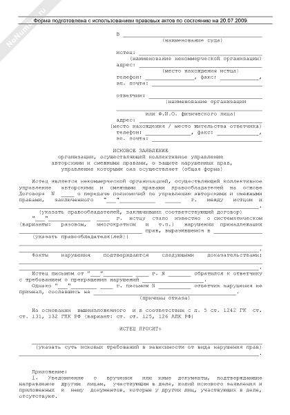- 616Исковое заявление организации, осуществляющей коллективное управление авторскими и смежными правами, о защите нарушенных прав, управление которыми она осуществляет (общая форма)