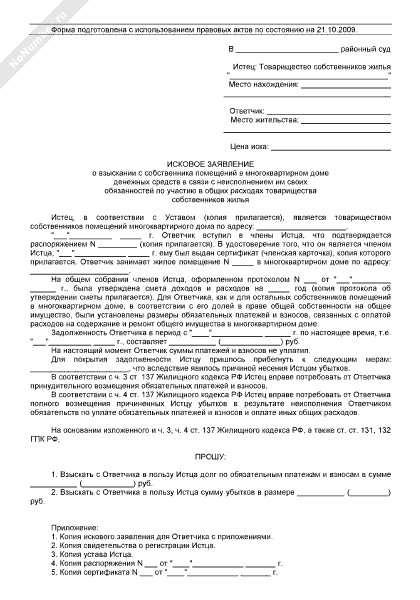 - 601Исковое заявление товарищества собственников жилья о полном возмещении причиненных ему убытков в результате неисполнения собственниками помещений в многоквартирном доме обязательств по уплате обязательных платежей и взносов и оплате иных общих расходов