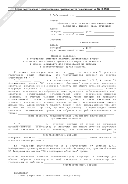 - 656Исковое заявление о понуждении общества включить предложенный вопрос в повестку дня общего собрания акционеров или кандидата в список кандидатур для голосования по выборам в соответствующий орган общества