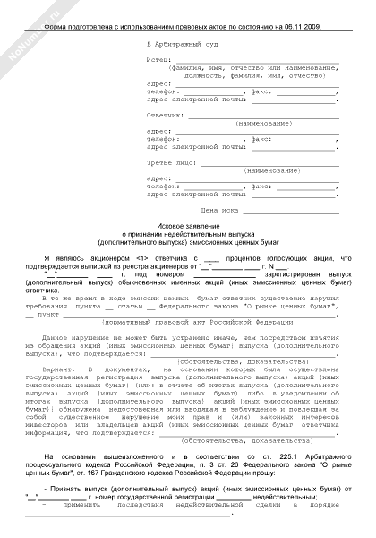 - 659Исковое заявление о признании недействительным выпуска (дополнительного выпуска) эмиссионных ценных бумаг