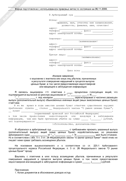 - 660Исковое заявление о взыскании с эмитента или иных лиц убытков, причиненных в результате совершения нарушений в процессе выпуска ценных бумаг, в том числе предоставления недостоверной или вводящей в заблуждение информации