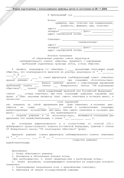 - 657Исковое заявление об обжаловании решения совета директоров (наблюдательного совета) общества, принятого с нарушением требований нормативных правовых актов, устава общества