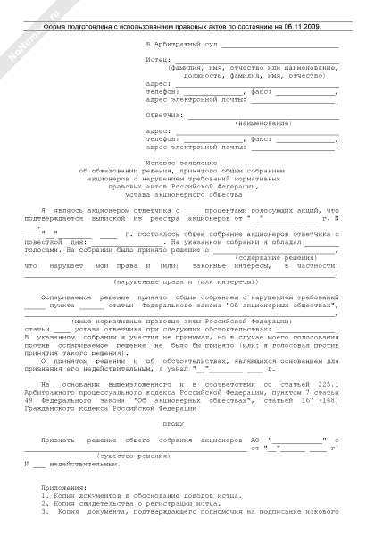- 655Исковое заявление об обжаловании решения, принятого общим собранием акционеров с нарушением требований нормативных правовых актов Российской Федерации, устава акционерного общества