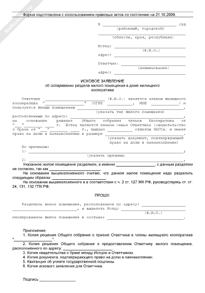 - 641Исковое заявление об оспаривании раздела жилого помещения в доме жилищного кооператива